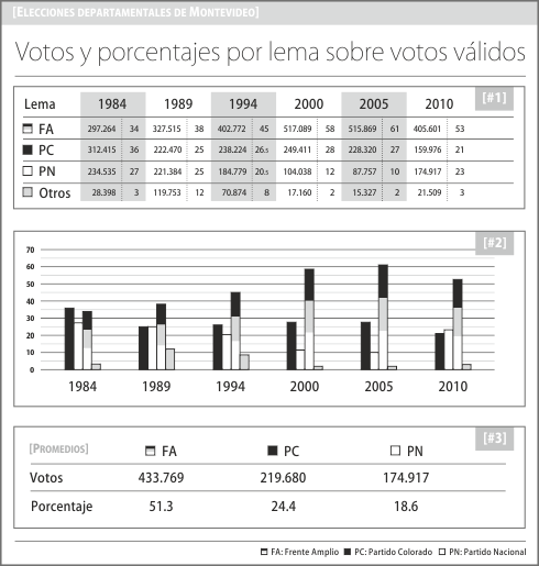 Milito en el Partido Colorado desde 1980, cuando Ope Pasquet me llevó al diario El Día y Jorge Otero hizo publicar mi primera columna política (en la página editorial, al lado de la foto de don Pepe; me saltaban los botones de la camisa…). El título de la columna era «¿Sabremos cumplir?» y patrocinaba el voto por «No» al proyecto de reforma constitucional de la dictadura que se plebiscitaba aquel año. En las internas de 1982 fui electo convencional nacional y departamental por «Libertad y Cambio», y no abandoné esa condición hasta que abandoné el país, en 1995, correteado por dos derrotas electorales ilevantables. Fueron quince años de lucha, primero contra la dictadura, después por la mayoría partidaria, más tarde por el Gobierno del Partido, entregando vida y hacienda con fervor, convicción y alegría; paladeando las mieles de la victoria y tragando las hieles de la derrota; desde el Gobierno y desde la oposición; haciendo de todo, librando mil batallas, contestatario siempre pero siempre orgánico, colorado sin redención. Durante los diecisiete años en el exterior, sostuve mi compromiso partidario colaborando de todas las maneras que permite la distancia. En mi periplo recorrí varias latitudes, conocí realidades mejores y peores, aprendí unas cuantas cosas, y volví más colorado que nunca. Estoy persuadido de que es necesaria una vigorosa presencia colorada y batllista en el sistema político, en la sociedad, en el país, para encontrar el rumbo que nos conduzca a la mejor versión de nosotros mismos, que no es esta de colectividad fracturada, crecientemente embrutecida y burdamente hedonista, parejamente, desde el Marconi hasta Carrasco (no he salido mucho al interior…). El Partido Colorado-Batllismo, el modo de pensar y de actuar colorado-batllista, en feraz (y a veces feroz) dialéctica con el Partido Nacional, fue el que orientó a la República en los tres o cuatro grandes cruces de caminos que enfrentamos en nuestra corta existencia como nación independiente. Y es ese modo, creo yo, el que debemos intentar que prevalezca una vez más, en esta larguísima transición hacia una nueva e imperativa modernidad. La tarea es urgente, perentoria, inaplazable. Cada día que pasa es un día en contra. Y cada elección, ni te digo. El Partido Colorado-Batllismo no es un cenáculo académico, ni una iglesia evangélica, ni una célula de acción directa; es un partido político, que tiene al gobierno en su ADN; que es malo (malísimo) haciendo oposición, porque respeta demasiado al Estado, a las instituciones, a la ley, al derecho; que es bueno (buenísimo) gobernando, porque respeta demasiado al Estado, a las instituciones, a la ley, al derecho; pero además porque tiene un sólido subsuelo ideológico cimentado de liberalismo, democratismo y republicanismo; una amplia planta baja programática alhajada de pragmatismo, reformismo y progresismo; y una luminosa terraza idealista, donde hay espacio para que florezcan todas las buenas ideas y todas las buenas prácticas que hacen a los pueblos más prósperos, más nobles, más felices. Una sola cosa es necesaria para seguir levantando el edificio: ganar. ¿De cualquier modo y a cualquier precio? ¿El fin justifica los medios? No, nada de eso. Aplicando todos los recursos legítimos en una justa lid electoral, pero todos, sin renunciar a ninguno, porque estamos en situación de emergencia: el país necesita Partido Colorado-Batllismo urgentemente, necesita liberalismo, democratismo, republicanismo, pragmatismo, reformismo, progresismo, idealismo. Todos los recursos, en todos los frentes Hay que ganar en el país, y a eso están dedicados otros mejores que yo. Pero hay que ganar también en los departamentos y, entre todos, muy especialmente en Montevideo, de eso específico agregado en múltiples planos. Sin embargo, precisamente en Montevideo, la coalición gobernante ha consolidado la figura que la academia caracteriza como de «partido hegemónico»: hace cinco elecciones que gana por goleada. Otro día podemos explorar las causas; ahora estamos hablando de los datos duros, que se muestran en el cuadro #1. O si prefieren, en gráfico de barras (ver cuadro #2). O si les gusta más, en promedios (ver cuadro #3). |