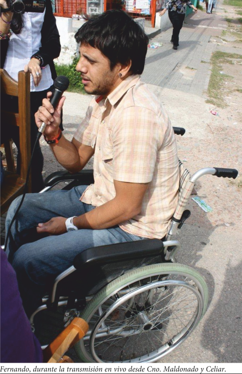 Luego conversamos con Fernando. Ya lo habían asaltado varias veces, cuando hace seis años, un sábado, trabajando en una farmacia allí a pocos metros, entró un joven que lo empujó, le dio un culatazo y un disparo que le pegó en la espalda, por lo cual quedó con paraplejia. A partir de allí está en silla de ruedas. Su hijo en aquel momento también tenía dos años. Nos habló de lo difícil que es seguir adelante, sin ayuda, sin tener un mango para pagar un abogado, para buscar evitar que otros pasen por lo mismo.