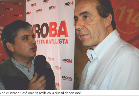 San José En nuestro nuevo desafío de ir recorriendo las ciudades del interior, le tocó el turno a la ciudad de San José. Aprovechamos que allí se desarrollaba el Congreso del PROBA, sector Propuesta Batllista del Partido Colorado. Allí se elegiría a su secretario general, cargo para el cual fue designado el senador José Amorín Batlle, con muy buena concurrencia de congresales. Uno de los anuncios fuertes que se lanzó fue la propuesta de bajar gradualmente el IRPF en caso de acceder al Gobierno, que se sustentaría con un control del gasto público, no aumentándolo y bajando de acuerdo al crecimiento del producto bruto interno. Hubo otros temas de fondo, como el tema descentralización y la postura que debe tomar el Partido sobre su participación en ella a nivel nacional y la formación de comisiones multidisciplinarias. |