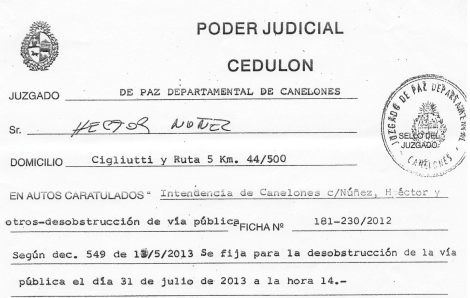 Cuando los políticos recorren nuestro país pueden agudizar todos sus sentidos, o usar solo su visión para encontrar escenarios que querrán tapar. Justamente uno de estos casos es lo que les está pasando a los vecinos del kilómetro 44,500 de ruta nacional número 5. Al pasar por ese lugar, si venimos por la ruta rumbo al sur y miramos a nuestra derecha —en especial ellos que llevan chofer— podemos apreciar a metros del terraplén varias construcciones irregulares, chapas, varejones, aunque algunas también de material. Según nos contó una vecina, la alcaldesa le mencionó que este panorama molestaba a autoridades que pasaban por allí. En ese mismo tramo de la ruta otro sentido entrará a llamar nuestra atención: nuestro olfato, y allí no importará si es de día o de noche, si vamos como conductores o como acompañantes. Un olor nauseabundo emana desde el lado izquierdo de la ruta, donde se encuentran las piletas de decantación en las que el frigorífico Canelones vierte sus fluidos, que van pasando de pileta en pileta hasta luego ser vertidos en un arroyo que a su vez los lleva al río Santa Lucía. De este mismo arroyo, bombas toman agua rumbo al frigorífico, todo esto en un área inundable, por lo que en muchas ocasiones se mezclan todas estas aguas. Pero ahora volvamos a la derecha de la ruta. Parece que según el vidrio a través del cual se ve la realidad es que se categoriza la gravedad de un grave. La Intendencia de Canelones les ha enviado un cedulón a todos los vecinos que ocupan esas construcciones precarias, para que las abandonen el 31 de julio de 2013 a la hora 14 como último plazo. Allí hay vecinos que viven hace muchos años. En la primera casa de material que encontramos en la esquina de la calle continuación Cigliutti y Álamo de Suárez (ruta 5 km 44.500), viven allí hace veinte años. Enfrente encontramos a Martín —quien nos contactó—, con su familia. Hace nueve años que está allí. Las imágenes que Google Earth muestra de la zona fueron tomadas en enero del año 2010. Podemos apreciar que eran varias las casitas que ya había instaladas en ese momento, a las que obviamente se fueron sumando otras en los últimos años, aunque la mayoría dice vivir allí hace más de un año. Incluso están puestas las columnas de Ute con sus respectivos medidores y la misma situación con los medidores de Ose. Varios vecinos nos mostraron los recibos de pago al día. En la semana se comunicó Martín De León con nuestro amigo Ruben Jorge Castro Latorre («el Ojo del Ciudadano»), buscando una ayuda, un medio que replicara sus reclamos. Por eso, este sábado 15 de junio, luego de transmitir nuestro programa Montevideo contigo por CX22 Radio Universal, nos dirigimos hasta Canelones para tener la información en el lugar. Allí nos reunimos con muchos vecinos. Viven más de veinte familias, con muchísimos niños pequeños. Nos contaron que son gente de trabajo; que desarrollan su actividad en las quintas, en el transporte de carga y en la construcción; que están allí en especial porque es un lugar tranquilo para criar a los niños; y que por supuesto no tienen otro lugar adonde ir. Pero la desesperación de estos vecinos radica en que les ha llegado a cada familia un cedulón del juzgado de paz departamental de Canelones: «en autos caratulados Intendencia de Canelones c/Núñez, Héctor y otros - Int. desobstrucción de vía pública. Ficha 181-230/2012. Según dec. 549 de 13/5/2013 se fija para la desobstrucción de la vía pública el día 31 de julio de 2013 a la hora 14». El documento es firmado en Canelones el 13 de junio de 2013 por Daniel Romasanta Herrera, oficial alguacil. A esta introducción a la situación de estas familias, agregamos la documentación que nos facilitaron los vecinos para que ustedes puedan sacar sus conclusiones y para que los actores políticos que pueden tratar el tema de cerca tengan elementos para darle una mano a tiempo a toda esta gente. || |