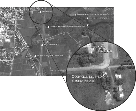 | La Intendencia de Canelones intima a la «desobstrucción de vía pública», pero las viviendas —algunas de material, otras más precarias— no están construidas obstruyendo una calle, sino sobre un camino de tropas en un predio cuya propiedad la Comuna no ha certificado, y que pertenecería al Minisiterio de Vivienda. Las construcciones más antiguas datan de hace casi veinte años, algunas de hace diez, y las más recientes, de un año. La imagen satelital muestra que a enero de 2010 (fecha en que según Google Earth fue tomada la fotografía) ya eran varias las casas construidas. El predio cuenta con tendido eléctrico de UTE y agua corriente de OSE. Los vecinos no están colgados, tienen contadores, reciben las facturas y pagan los servicios. |
