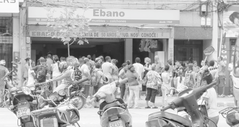 El jueves 23 de enero fue el primer día que vimos guinchar un vehículo por estar estacionado en la puerta de Ébano. Los días anteriores el guiche seguía de largo a pesar de la cantidad de motos y autos que había estacionados. Estaba más ordenado el lugar. La cola se hacía en la esquina de Felipe Sanguinetti, los números se daban por la esquina de Munar, estos números se comenzaron a dar el miércoles, ante la cantidad de personas que se abarrotaban en la puerta, tapando la entrada a todos los otros comercios, ya que la cola daba vuelta completamente la manzana. Ese mismo día, sobre las 11 de la mañana aparecen de improviso varios móviles de la Policía en la esquina de 8 de Octubre y Felipe Sanguinetti. Los efectivos sacan del principio de la larga cola a un joven que estaba organizando a las personas en grupos de diez para poder ingresar a Ébano y que pertenece a la mueblería, lo ponen sobre un patrullero para cachearlo, le patean los tobillos para que abra sus piernas y lo revisan. Minutos después lo consultamos sobre lo sucedido. Resultó ser sobrino del dueño de Ébano. Nos dijo que querían saber qué estaba pasando allí, porque había muchas versiones, entre ellas que allí se lavaba plata, que se decía cualquier cosa. Le dijimos que era extraño porque Ébano tenía uno o dos policías del servicio 222 todo el día en la puerta y nos dijo que eran servicio 223 los que cuidan el ingreso al lugar. Tal vez un viejo artículo de prensa (La República, 31 de mayo de 2000 → http://bit.ly/1eb11Nt) sea la explicación de por qué se hizo presente la policía y no consultó a la propia policía de la puerta: «“Ocurre que hay policías que son contratados directamente por particulares para cumplir funciones de vigilancia y están al margen de la normativa vigente”, señaló el secretario de Estado [el entonces ministro del Interior Guillermo Stirling]. En este sentido indicó que este servicio —conocido popularmente como 223— pone en riesgo “la imagen de la Policía” ya que está “al margen del conocimiento de los propios jerarcas policiales”». || |