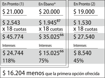 | * De los $ 20.000, $ 8.500 se reciben en mercadería, en este caso, un LED de 22". (1) Primera opción ofrecida. (2) Segunda opción ofrecida luego de mencionar los préstamos que se están otorgando en Ébano (ver nota aparte «Todos los nombres»), también de Pronto. |