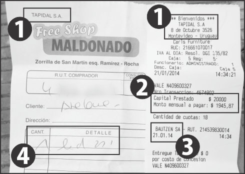 | 1. Tapidal S.A. está domiciliada en la ciudad de Maldonado, donde tiene su local de ventas, al igual que en la ciudad de Pando. También tenía en Rocha (la dirección que figura en la boleta), donde cerró. Tapidal S.A. no está registrada con dirección en Montevideo. || 2. Préstamo de $ 20.000 ($ 8.500 en mercadería) en 18 cuotas de 1.945,87. El préstamo es de Pronto, pero para este monto y para 18 cuotas no es este el valor de la cuota ofrecida al cliente potencial en una sucursal de la financiera (ver recuadro «Tu préstamo está pronto», p. 11).|| 3. «BAUTZEN SA, es una Empresa Administradora de Créditos (EAC) emisora de la tarjeta de crédito VISA de Pronto! y, que además, comercializa órdenes de compra para el consumo. Se encuentra supervisada por el Banco Central del Uruguay (por mayor información puede accederse a www.bcu.gub.uy) y a las normas que regulan la actividad de las EAC. KEDAL SA es una empresa dedicada a la comercialización de préstamos personales en efectivo. Ambas sociedades, aun cuando el marco regulatorio que las rige es diferente, ajustan su actuación a la normativa bancocentralista en materia de relacionamiento con los clientes y transparencia en la información, y adoptan en su gestión idénticos estándares de calidad y de normas de conducta de sus colaboradores. BAUTZEN SA y KEDAL SA son auditadas anualmente por KPMG». (→ http://www.pronto.com.uy/uc_8_1.html).|| 4. El cliente está obligado a recibir parte del préstamo en mercadería. En este caso, un televisor LED 22", que se cobra a $ 8.500, 42 % más caro. El mismo televisor cuesta $ 5.990 en Punto Unión, una casa de electrodomésticos a pocos metros de Ébano. || |